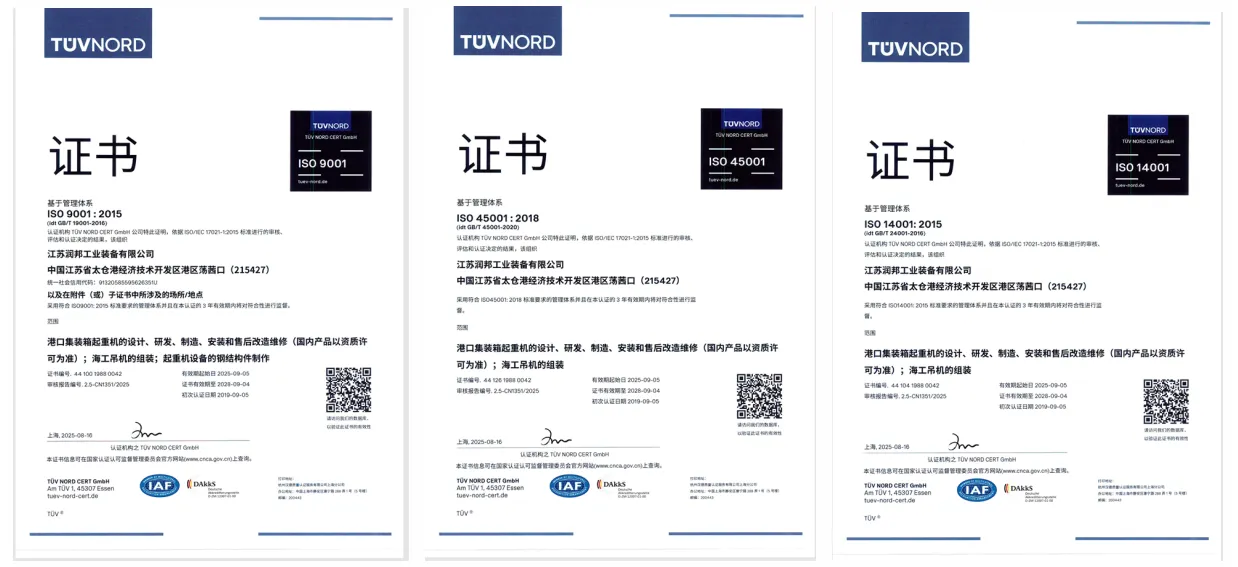 近日,润邦工业经专家组的严格审核,各项制度的制定及执行均符合IOS90001质量管理体系、ISO14001环境管理体系和ISO 45001职业健康安全管理体系三体系标准要求,顺利通过复评评审,成功续证获得TUV NORD颁发的三体系证书。